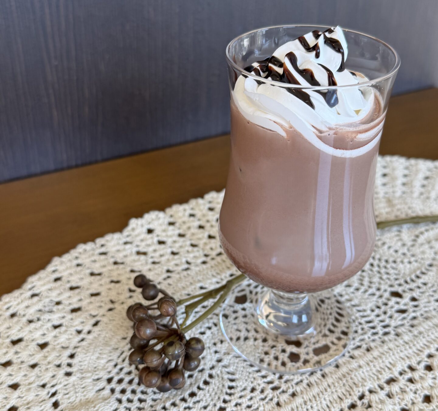 ほろ苦い味わいに、甘いホイップとチョコレートソースをトッピング。